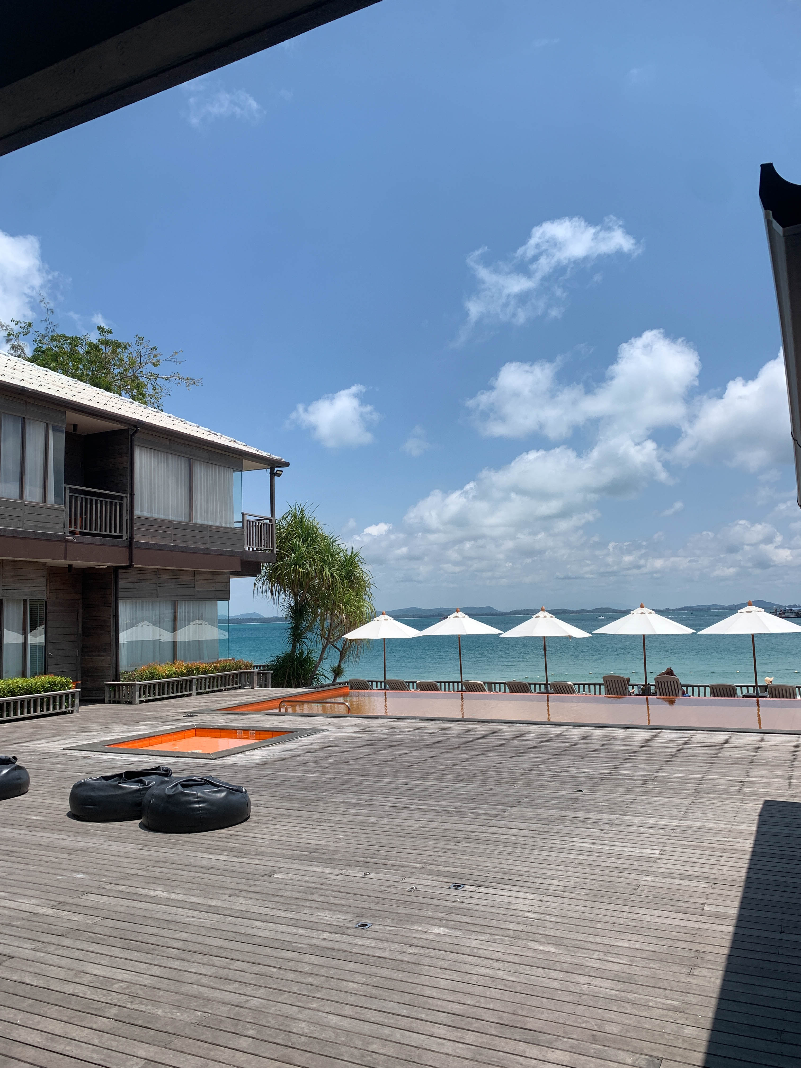 一抵達飯店,在櫃台 check-in 時,就能看到嚮往已久的度假村景色:海、沙灘、躺椅、遮陽傘、游泳池!