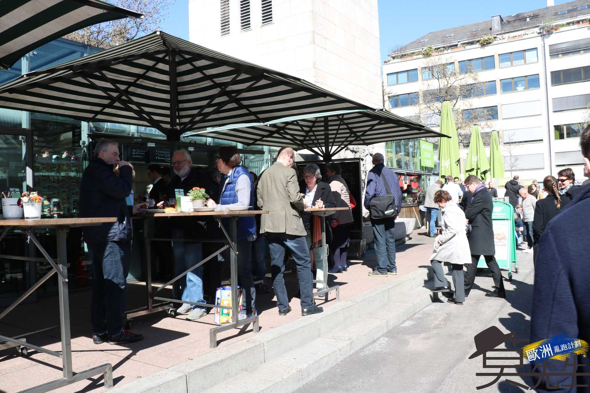 我到的時候接近午餐時間,中午來這邊的多是周邊的上班族,趁午餐時間出來透透氣;同時他們也趕著時間,所以只有桌子沒有椅子,站著吃。